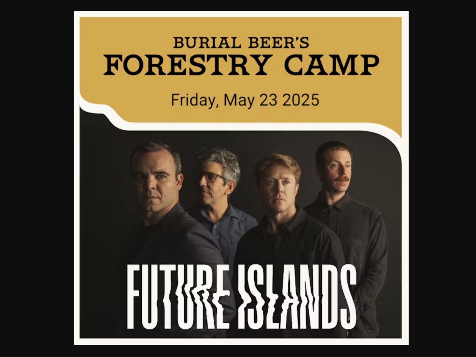 - Burial Beer Co. Presents: Future Islands - Fri, May 23rd, 2025 - Forestry Camp - 10 Shady Oak Drive - Asheville, NC 28801 - Doors 5PM || Show 7PM - This event is outdoors and rain or shine. - From their start, Future Islands have been singular and instantly identifiable. Samuel T. Herring’s life-worn croons and cries backlit by Gerrit Welmers’ melodies and charged by the rhythms of William Cashion and Michael Lowry. That premise hasn’t changed on People Who Aren’t There Anymore, but the people have. There’s a pain and a joy that’s in Herring’s voice that’s only been rivaled by their legendary live performances, but never captured in their studio albums, that feels like it’s been untethered for the first time. - Future Islands have played nearly 1,500 shows – shows that have bruised bodies, frayed vocal cords, provided escapes for audiences, and healed their messengers. People Who Aren’t There Anymore is a major work from a band at an inflection point: they’re discovering new ways to experience the world, because the old ways weren’t working. That freedom has led to the most fully realized, most transparently honest statement in their 17 years as a band. - **People Who Aren’t There Anymore VIP Experience available