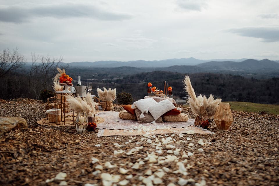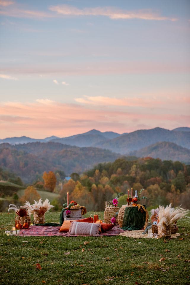 - Escape into a world of comfort and style with our luxury picnic services in Asheville, North Carolina. Whether you’re planning a romantic date, a milestone celebration, or an intimate wedding, we specialize in creating unforgettable picnic experiences tailored to your vision. We handle everything from design and setup to cleanup, so all you need to do is arrive and enjoy. Our curated picnic spaces are perfect for a variety of occasions, including proposals, anniversaries, birthdays, elopements, micro weddings, bachelorette parties, and more. Choose from stunning locations such as scenic parks, the breathtaking Blue Ridge Mountains, our partnered wedding venues, or even your own backyard or vacation rental. No matter the setting, we ensure your space is thoughtfully styled and equipped with all the comforts to create a unique memory. We collaborate with Asheville's amazing local food vendors to bring you delicious, high-quality cuisine for your event. Our team takes care of all the heavy lifting—packing, transportation, setup, and breakdown—allowing you to fully relax and savor the moment. From cozy blankets and elegant table settings to personalized touches, we aim to create an experience as beautiful and stress-free as possible. Let us bring your dream picnic to life in Asheville, where the beauty of nature meets the joy of celebration.