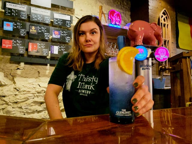 Thirsty Monk's famed multistory flagship taproom in the heart of Downtown Asheville is a premier craft beer and cocktail destination with three unique experiences in one building. Top of The Monk, one of Asheville’s most beloved craft cocktail bars, offers some of the finest tipples in town. Thirsty Monk Brewery’s Patton Ave. Taproom features a full lineup of the brewery’s Belgian-Rooted Modern Ales, along with Holy Water Hard Seltzers and classic pub cocktails. The new Delirium Bar is the place to experience some of the finest Belgian beers in the world, perfectly poured in a true Old World setting, surrounded by a medley of monks and elephants.