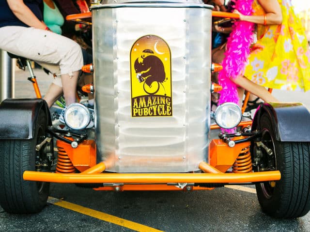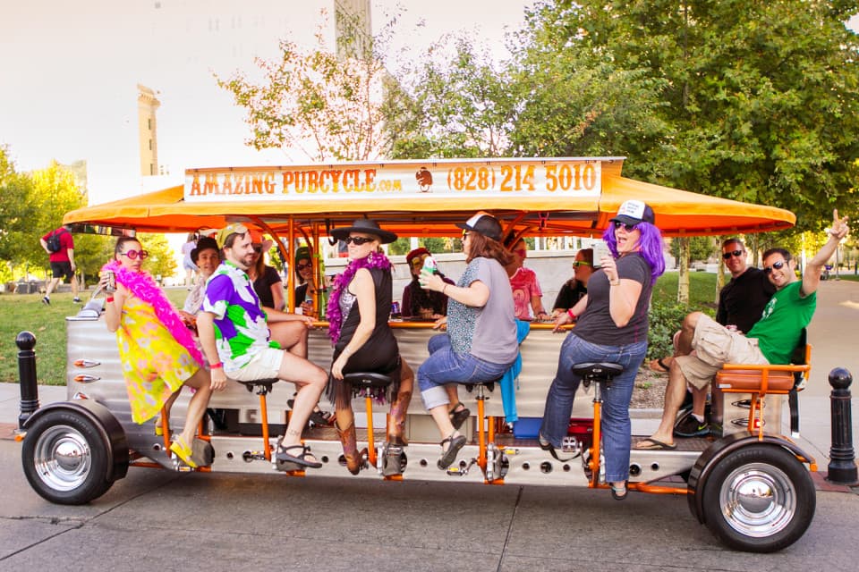 - Now with plastic curtains and heaters onboard for the winter! - If you are looking for the most memorable fun in Asheville, you have come to the right place! We aim to provide tours to fit your all occasions or just pedal and cruse around town on the low-flying adventure machine. The Amazing Pubcycle is a wicked-cool 13-person pedal powered (motor assisted) vehicle like no other. 10 Pedalers, 3 Non-Pedalers, and your Conductor navigates that Central Business District landscape with a healthy dose of humor, style and ridiculous entertainment. Tours are BYOB - beer or wine only please. Your chariot awaits!