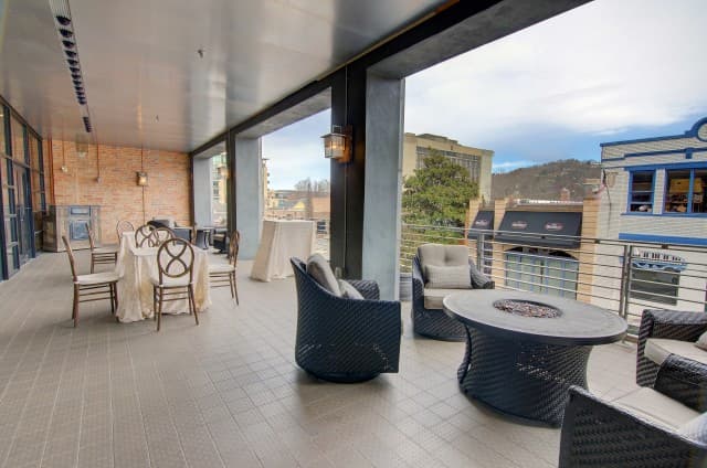 The Venue is a full-service Event Facility located in the center of downtown Asheville, offers a spacious floor plan of 13,000 + sq feet, with three unique sections. Each section has private entrances - The Market Street level, the Mezzanine and The Second floor with a beautiful balcony area overlooking the scene of downtown Asheville. The Venue boasts modern-rustic elegance, featuring brick walls, exposed beams, and vintage tile floors.